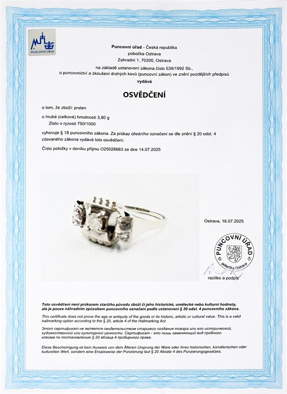 zlato o ryzosti 750/1000 váha 3,80 g diamanty, prostřední diamant 0,25 ct velikost 51 míry hlavy 1,5 x 1 cm výborný stav osvědčení puncovního úřadu kameny s garancí pravosti zkontrolované v gemologické laboratoři