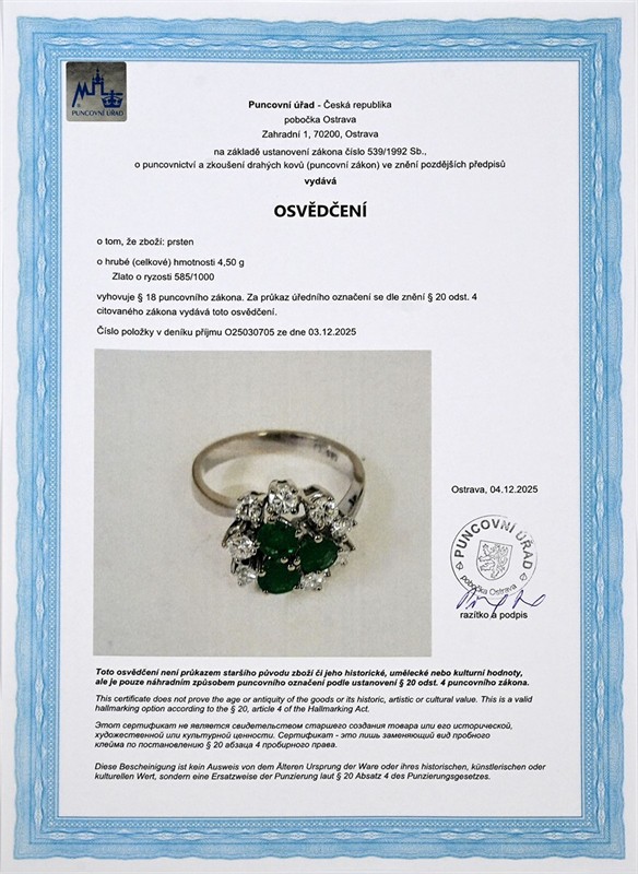 Materiál: žluté zlato o ryzosti 5851000 Hmotnost: 4,50 g Rozměry: velikost prstenu 52, míry hlavy 1,4x1,2 cm Drahokamy: 9 ks přírodních kulatých briliantových diamantů, celkem 0,80 ct, bílý (G–H–I), čistota VS-SI1-SI2, průměr 2,5– 3,1 mm 3 ks přírodních smaragdů, celkem 0,96 ct, kulatý kombinovaný, zelený, semitransparentní, průměr 4,2-4,4 mm Stav: výborný Doklady: Osvědčení Puncovního úřadu České republiky Certifikát z gemologické laboratoře je součástí šperku Pro vaše maximální pohodlí nabízíme kompletní zlatnický servis: úpravy velikosti, odborné opravy, rhodiování, výměny kamenů, profesionální čištění, leštění i znalecké odhady. Vše přizpůsobíme vašim přáním.