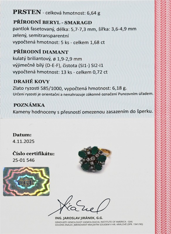 Materiál: žluté zlato o ryzosti 585/1000 Hmotnost: 6,64 g Rozměry: velikost prstenu 57,5, míry hlavy 1,8x1,7 cm Drahokamy: 13 ks přírodních kulatých briliantových diamantů, celkem 0,72 ct, bílý (D–E–F), čistota (SI1-) SI2-I1, průměr 1,9– 2,9 mm 5 ks přírodních smaragdů, celkem 1,68 ct, pantok fasetovaný, zelený, semitransparentní, délka 5,7-7,3 mm, šířka 3,6-4,9 mm Stav: výborný Doklady: Osvědčení Puncovního úřadu České republiky Certifikát z gemologické laboratoře je součástí šperku Pro vaše maximální pohodlí nabízíme kompletní zlatnický servis: úpravy velikosti, odborné opravy, rhodiování, výměny kamenů, profesionální čištění, leštění i znalecké odhady. Vše přizpůsobíme vašim přáním.