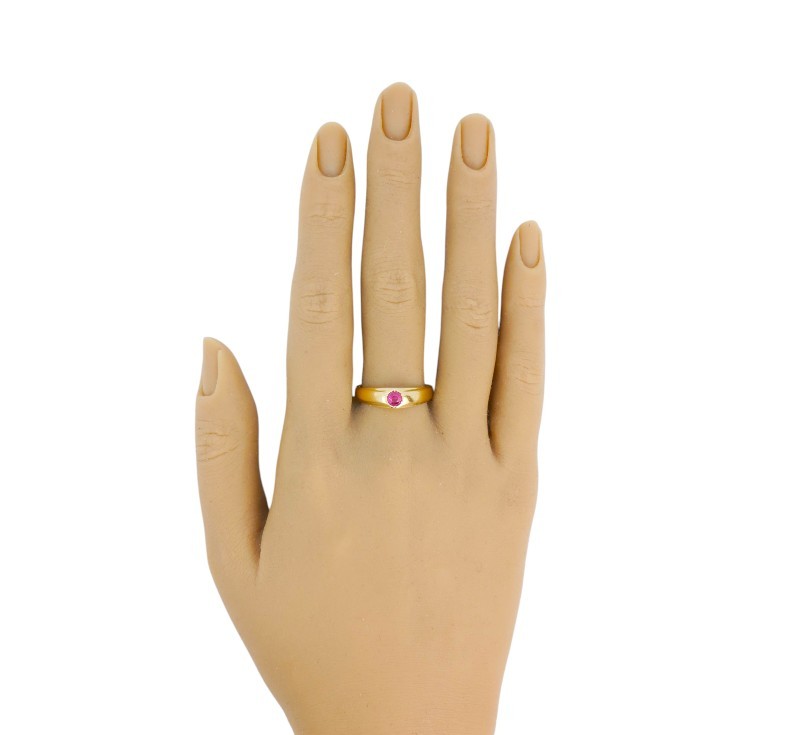 Elegantní prsten vyrobený ze zlata ryzosti 585/1000 hladká obroučka směrem k horní části se jemně rozšiřuje a přechází do masivnější hlavy prstenu, což mu dodává moderní a solidní vzhled. Hlava je zdobená rubínem. Velikost 66. Hmotnost 3,47 g.