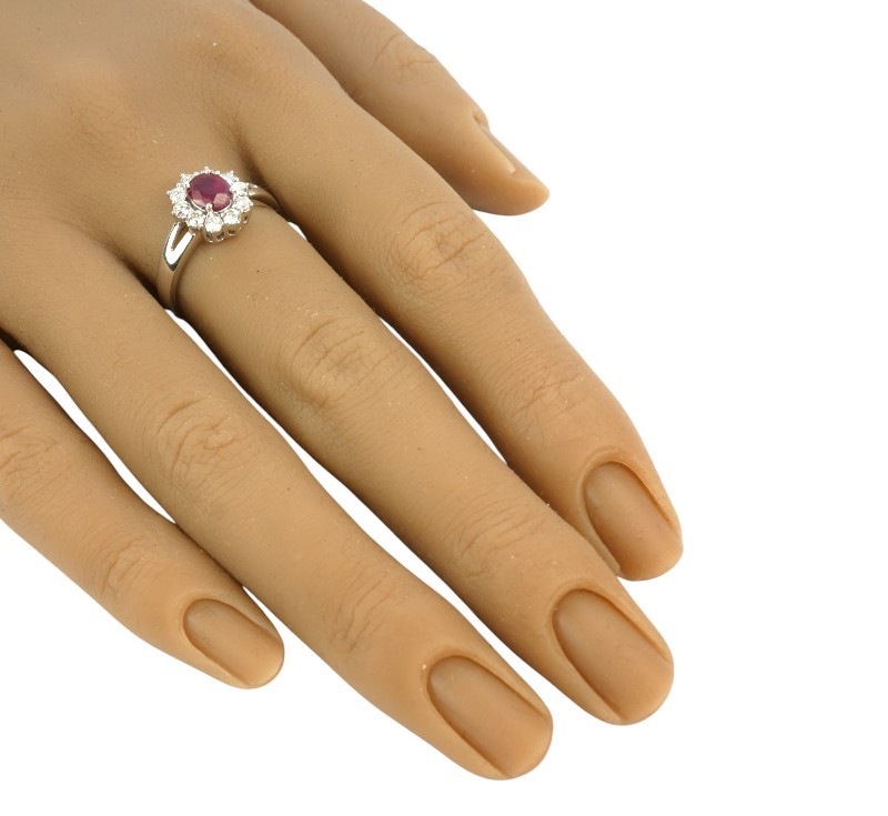 Prsten z bílého zlata ryzosti 585/1000 osazený nádherným přírodním rubínem o hmotnosti 0,90 ct a diamanty briliantového brusu o celkové hmotnosti 0,45 ct. Celková hmotnost prstenu je 2,70 g. Velikost 56.
