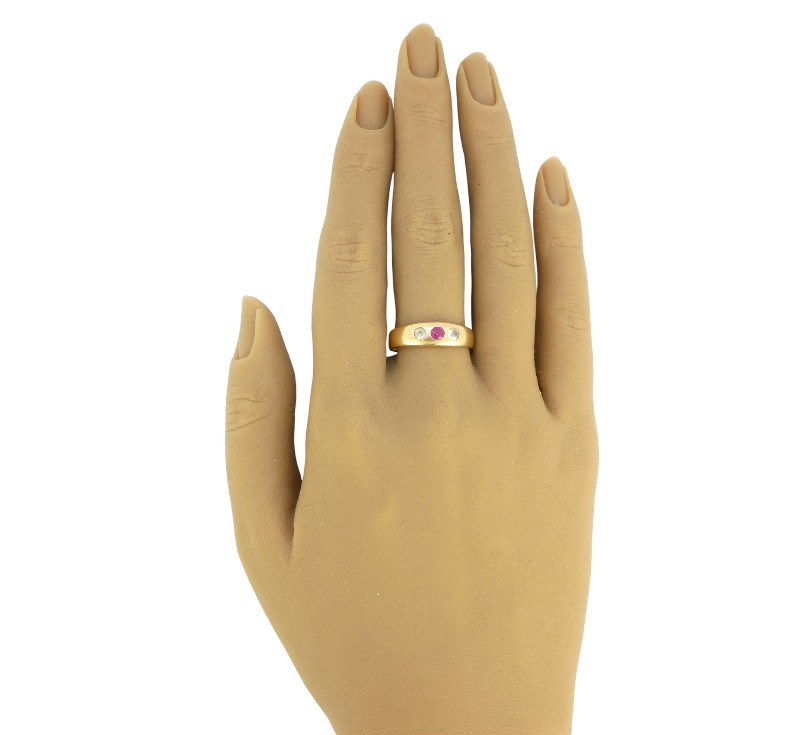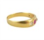 Prsten ze žlutého zlata ryzosti 585/1000 (punc liška) zdobený syntetickým rubínem a leukosafíry. Velikost prstenu 65, celková hmotnost 3,72 g.