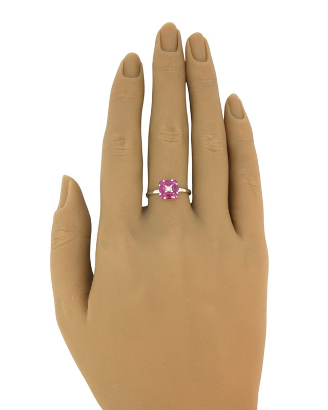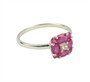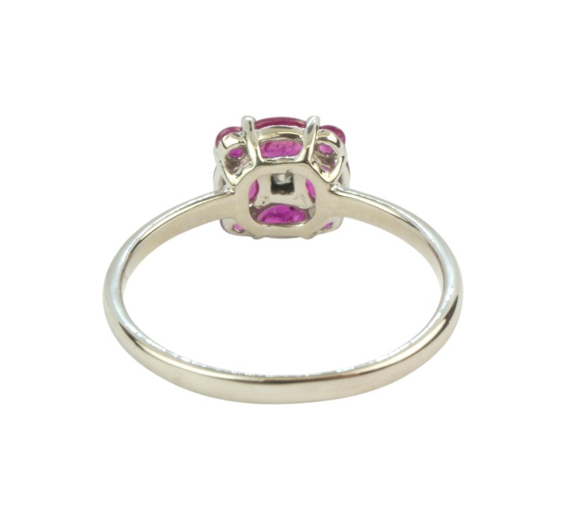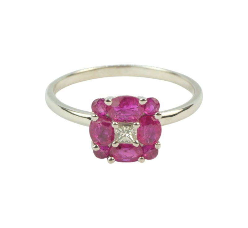 Prsten z bílého zlata ryzosti 585/1000 osazený přírodními rubíny o celkové hmotnosti 0,80 ct a diamantem o hmotnosti 0,07 ct. Celková hmotnost prstenu je 1,97 g. Velikost 56.