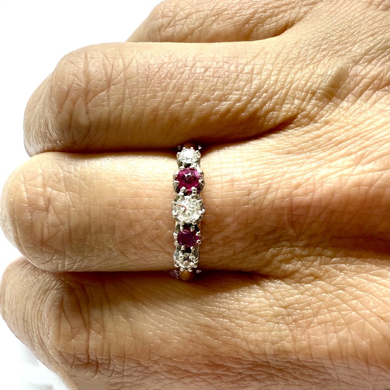 Půvabný, starý, zlatý prsten s brilianty a rubíny. Šperk byl zhotoven ze zlata ryzosti 14 karátů (585/1000), o celkové váze 2,99 g. Zlato je růžového odstínu, krapny ve kterých jsou drahokamy zasazeny jsou ze zlata bílého odstínu. Prsten zdobí tři brilianty o celkové váze cca 0,39 ct. Velikost 55. Perfektní stav. Původní, stará etuje je součástí prodeje.