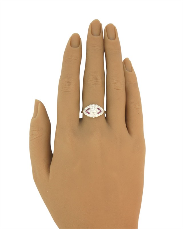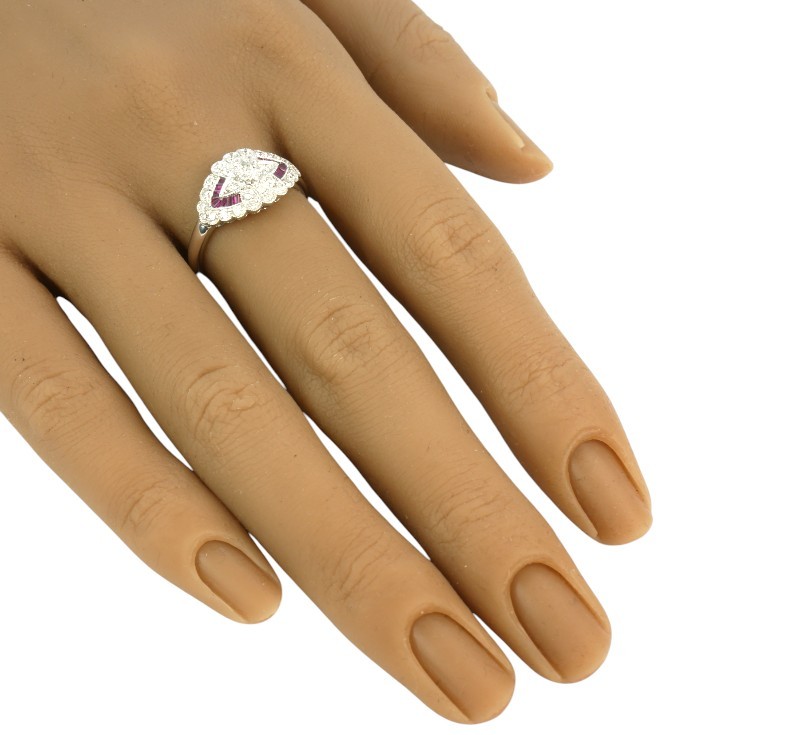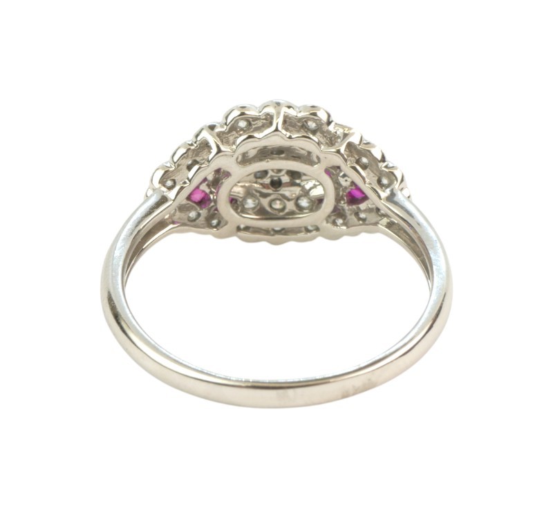 půvabný prsten v art deco tvarosloví z bílého zlata ryzosti 585/1000 osazený přírodními rubíny o celkové hmotnosti 0,10 ct a diamanty briliantového brusu o celkové hmotnosti 0,45 ct (SI-PI/H). Celková hmotnost prstenu je 2,80 g. Velikost 56.