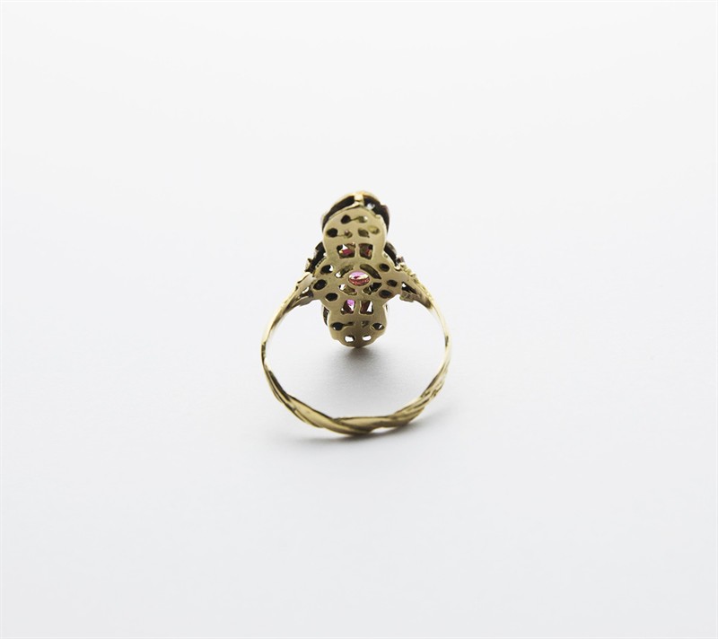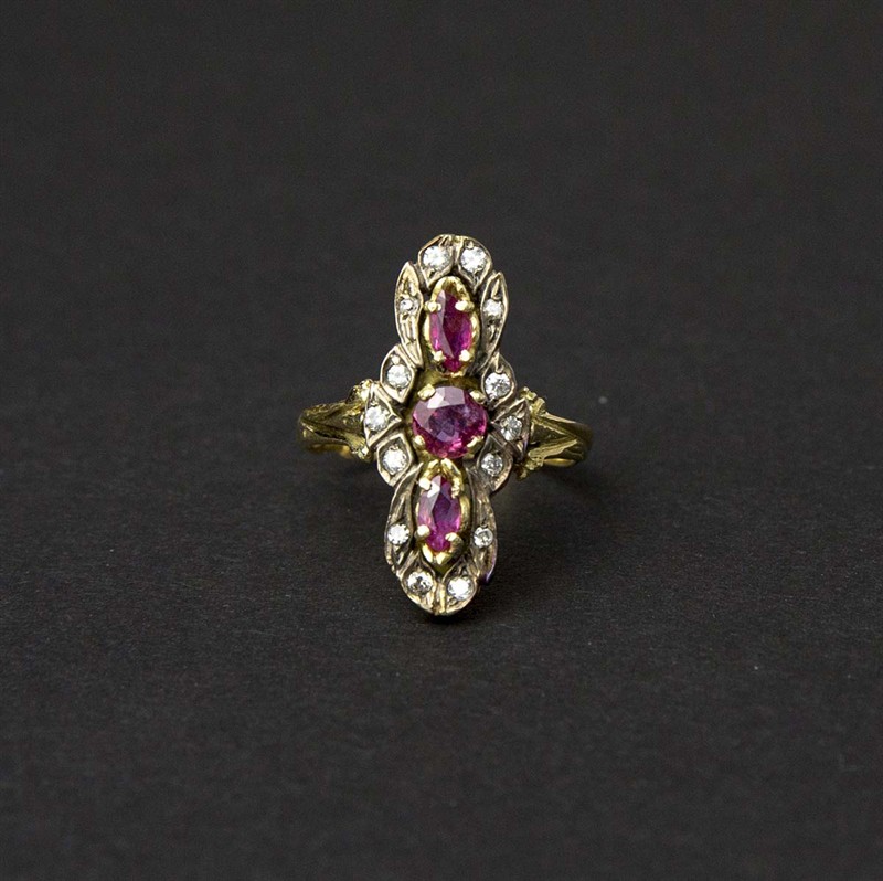 zlatý prsten se syntetickými rubíny a diamanty zasazenými ve stříbře, 2 rubíny markýzového brusu 0,4 ct, centrální rubín briliantového brusu 0,3 ct, 14 diamantů starého briliantového brusu o celkové hmotnosti 0,28 ct, Au btto 3,85 g/750/1000, Západní Evropa, kolem r. 1935, osvědčení Puncovního úřadu, velikost prstenu 57