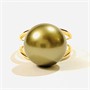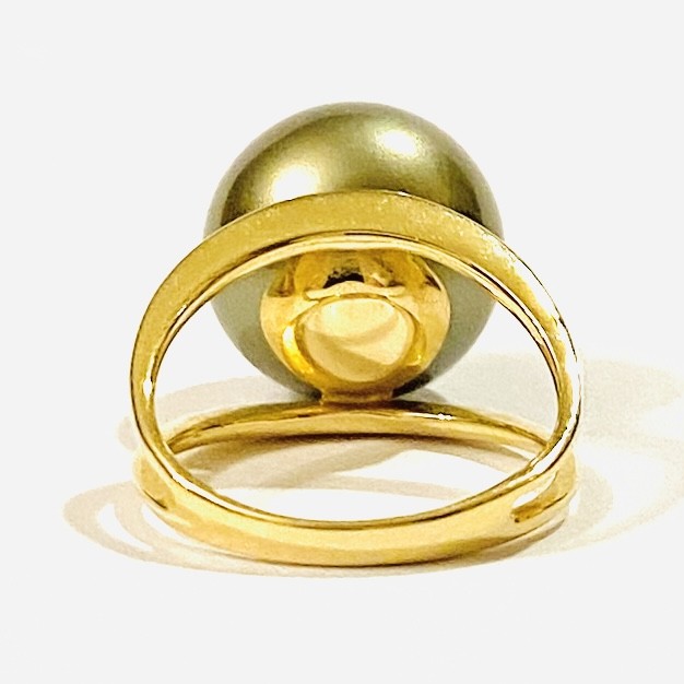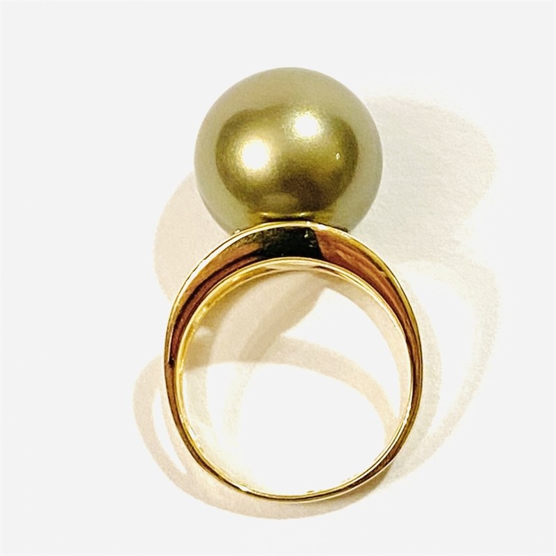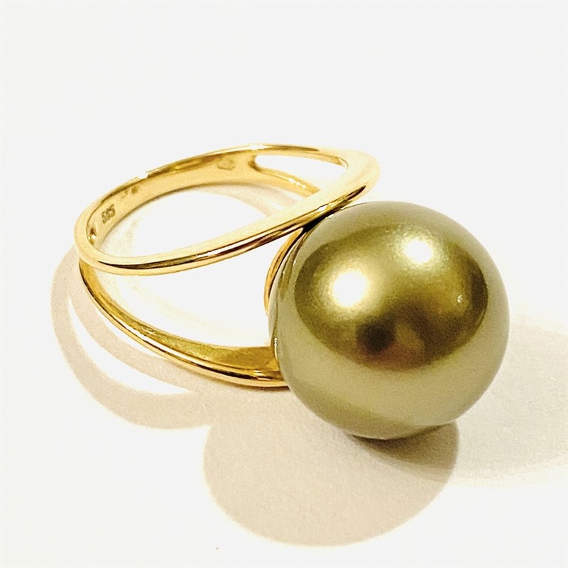 Výrazný, moderně pojatý prsten osazený velkou imitací thajské perly, díky rozestupující se dvojité šíně působí šperk lehce a vzdušně. Kvalitní německá zlatnická práce z počátku 21. století. Zhotoveno ze žlutého 14 karátového zlata, tj. o ryzosti 585/1000; nově opatřeno puncem Z-58 (labuť 4) a ryzostní číslo zevnitř šíny. Hmotnost 7,26 g, velikost 55, průměr perly 14 mm. Ve velmi zachovalém stavu, odborně vyčištěno a vyleštěno zlatníkem.