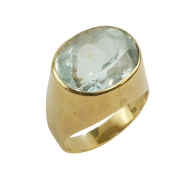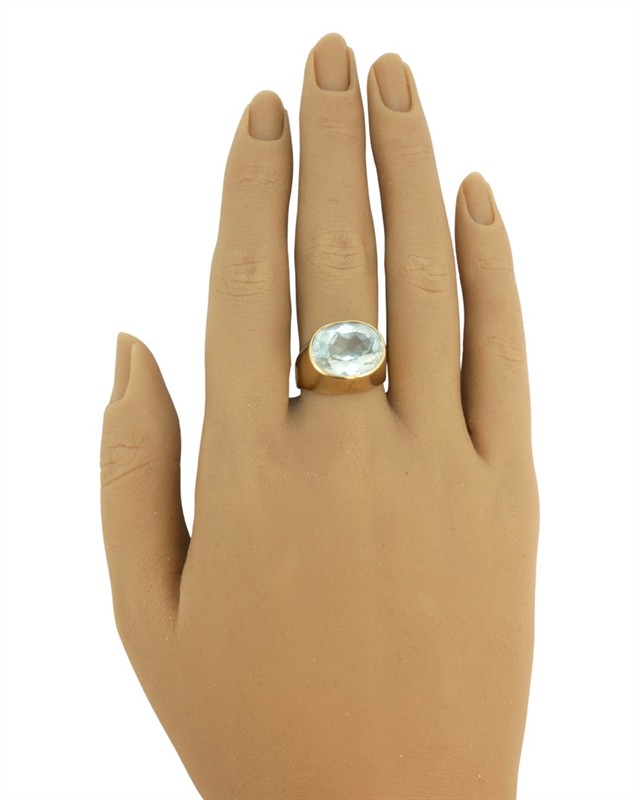 Výrazný designový prsten prsten ze žlutého zlata ryzosti 585/1000/1000 s velkým oválným topazem světlemodré barvy. Celková hmotnost prstenu je 8,16 g. Velikost 60.