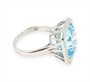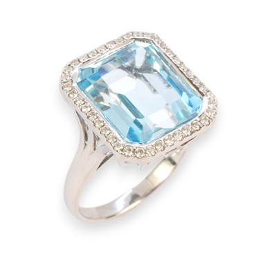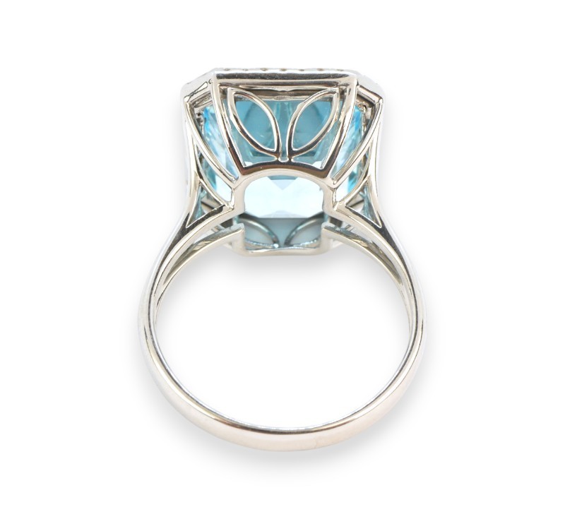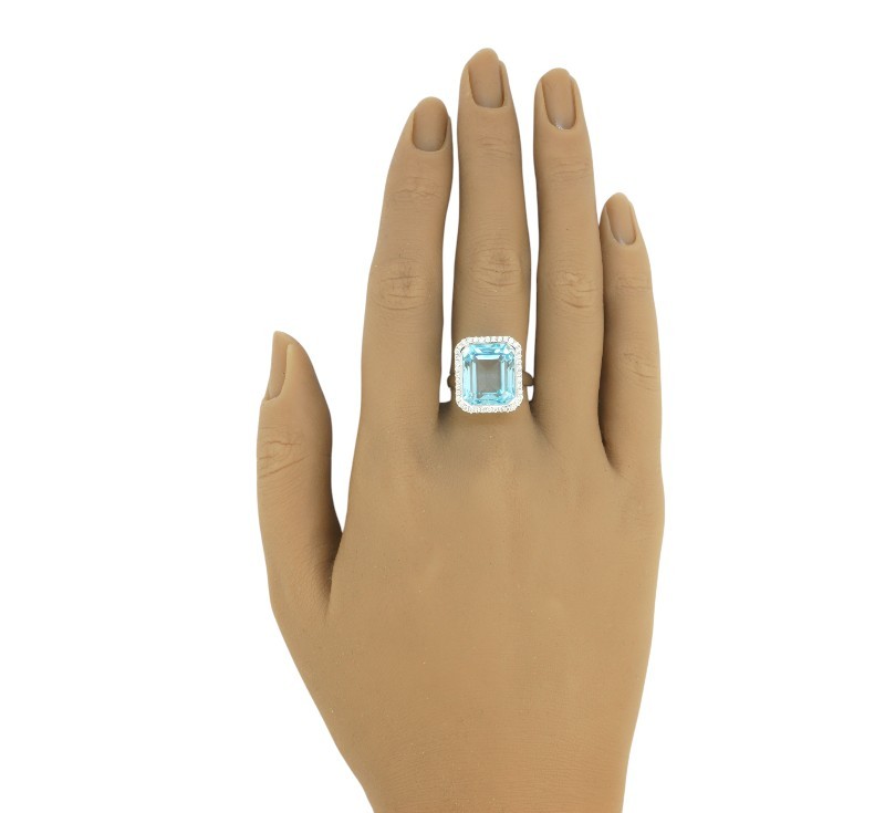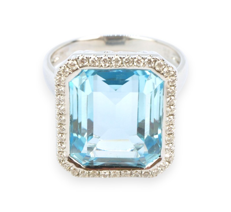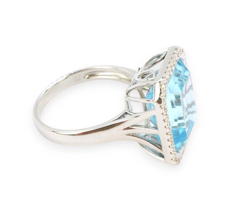 Prsten z bílého zlata ryzosti 585/1000 osazený velkým přírodním topazem o hmotnosti 9,52 ct a diamanty briliantového brusu o celkové hmotnosti 0,30 ct (SI-PI/H). Celková hmotnost prstenu je 6,89 g. Velikost 57.