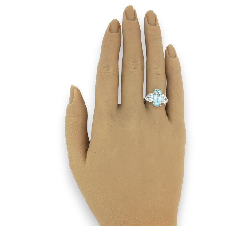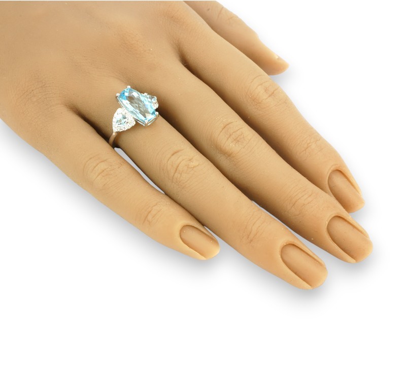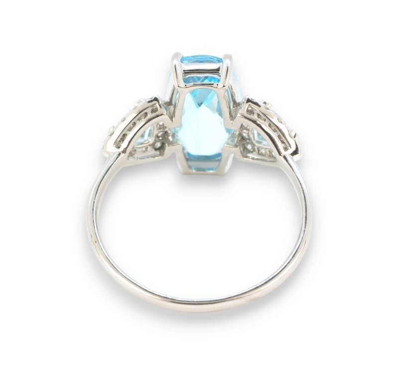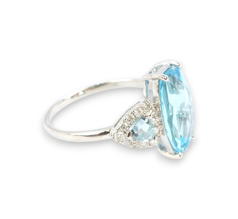 Prsten z bílého zlata ryzosti 585/1000 osazený topazy o celkové hmotnosti 4,00 ct a diamanty briliantového brusu o celkové hmotnosti 0,30 ct (PI/H). Celková hmotnost prstenu je 3,15 g. Velikost 56.