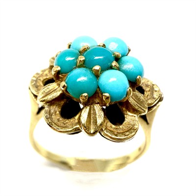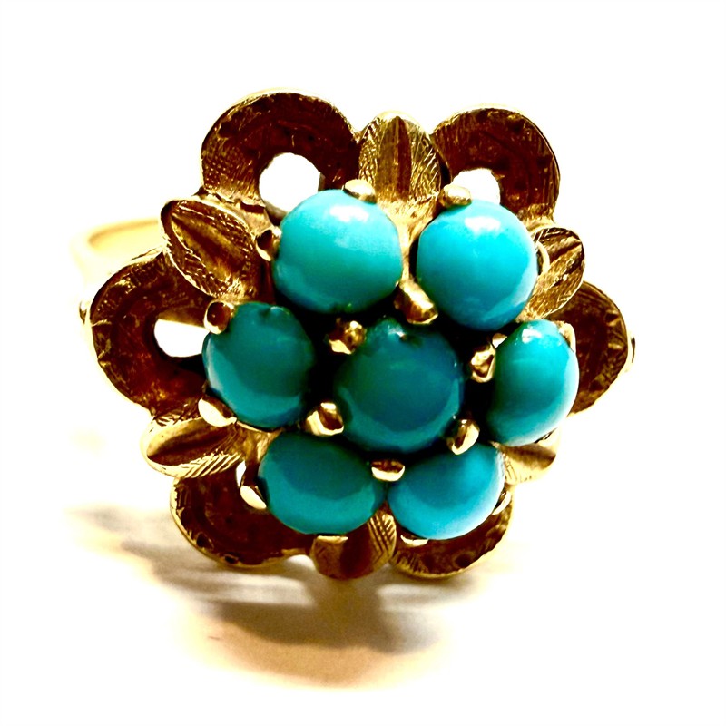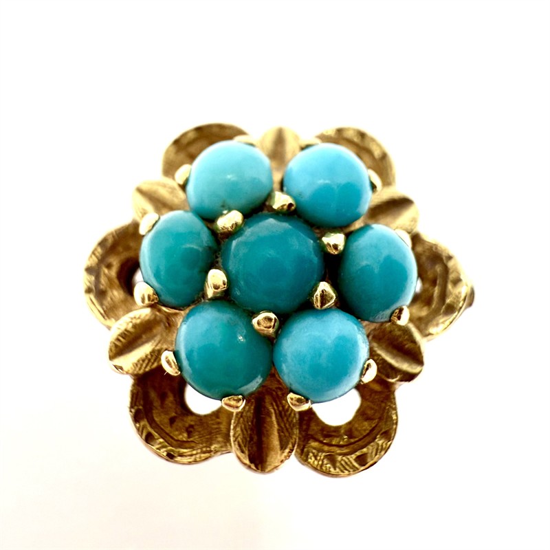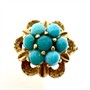 Malebný prsten z 18ti karátového zlata (Au 750/1000). Prsten zdobí sedm přírodních tyrkysů seskupených pomocí krapen do tvaru květu. Zlaté okvětní lístky zdobeny ručním gravírováním. Celková váha 3,66 g . Velikost 53. Perfektní stav.