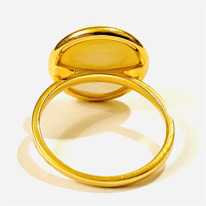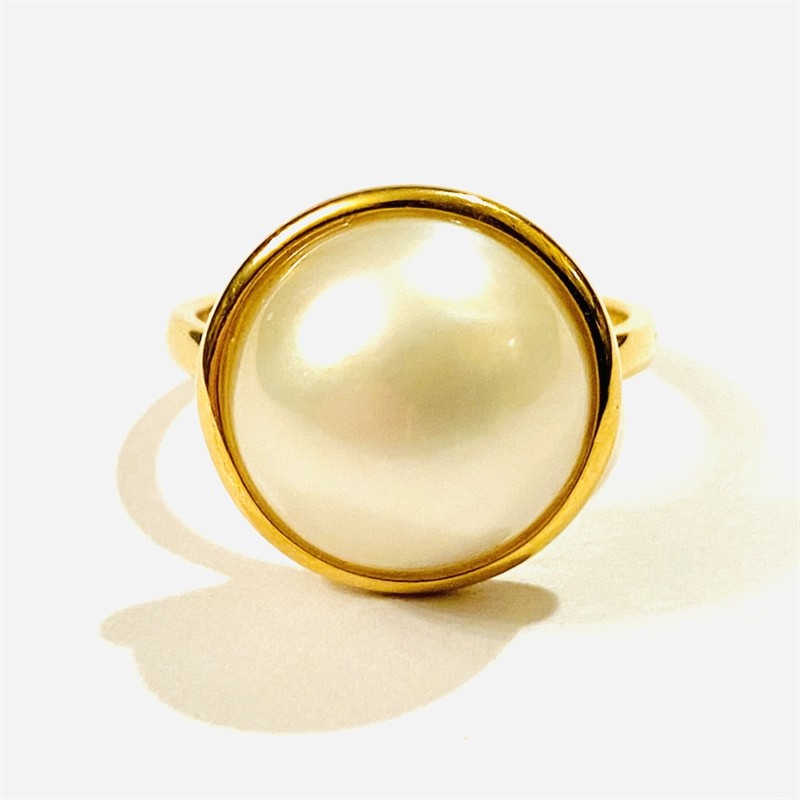 Elegantní prsten koktejlového typu, jehož dominantou je velká přírodní kultivovaná bílá perla, která je zasazena v plně přiléhající obrubě. Díky tenké šíně se prsten pohodlně nosí. Moderní šperk z 10. let 21. století od známé španělské firmy Tous, jež zaujme svou čistou a minimalistickou estetikou. Zhotoveno ze sytého žlutého 18 karátového zlata, tj. o ryzosti 750/1000; punc Z-35 (kohout 3) zevnitř šíny, ryzostní číslo a značení výrobce zvnějšku šíny. Hmotnost 4,07 g, velikost 56, průměr hlavice 15 mm, průměr perly 13 mm. V téměř nenošeném stavu. Odborně vyleštěno zlatníkem.