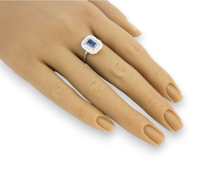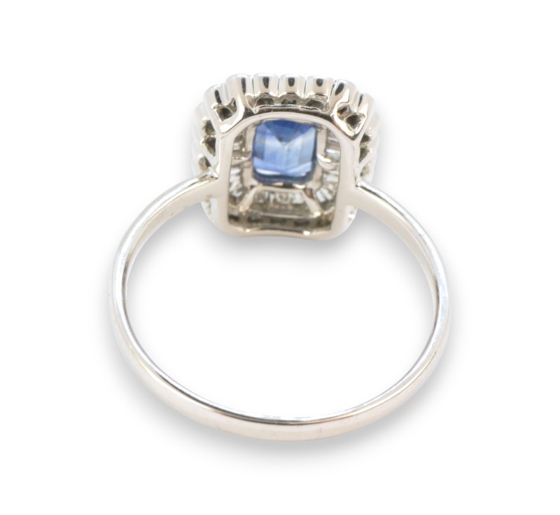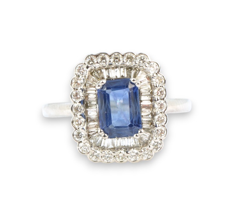 Prsten z bílého zlata ryzosti 585/1000 s přírodním středně modrým safírem o celkové hmotnosti 1 ct a diamanty briliantového a bagetového brusu o celkové hmotnosti 0,5 ct. Celková hmotnost prstenu je 3,02 g. Velikost 56.