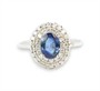 Prsten z bílého zlata ryzosti 585/1000 s přírodním safírem o celkové hmotnosti 0,70 ct a diamanty briliantového brusu o celkové hmotnosti 0,40 ct. Celková hmotnost prstenu je 2,88 g. Velikost 57.