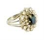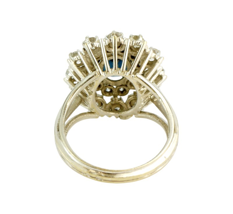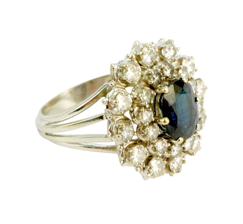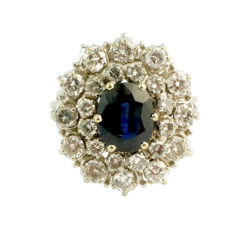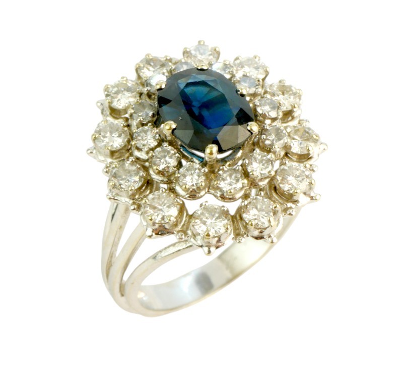 Nepřehlédnutelný luxusní prsten z bílého zlata ryzosti 750/1000 zdobený safírem a diamanty brilantového brusu celkové hmotnosti 1,80 ct. Celková hmotnost prstenu je 8,0 g. Velikost 54-55.
