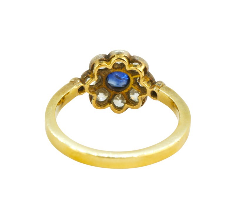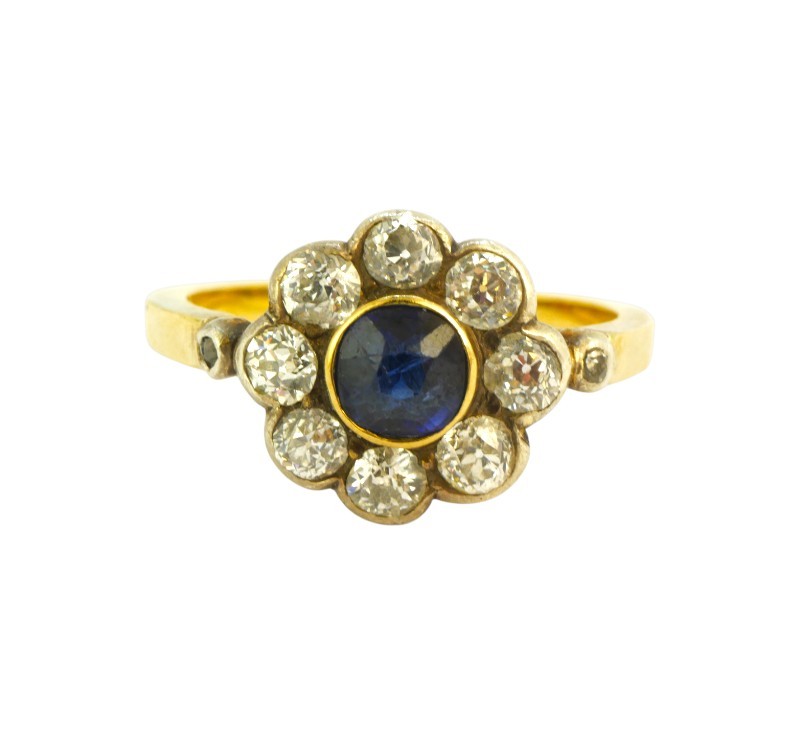 Starožitný prsten ze žlutého zlata ryzosti 585/1000 zdobí hlava jako květina se safírovým středem a briliantovými okvětními lístky. Diamanty briliantového brusu mají celkovou hmotnost cca 0,65 ct. Velikost prstenu je 56, celková hmotnost 3,47 g.
