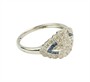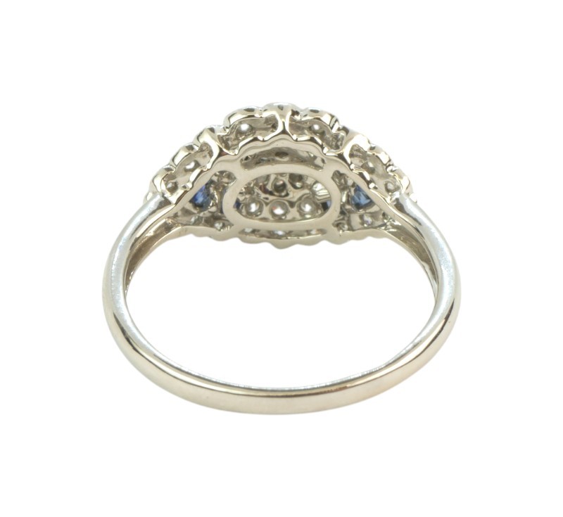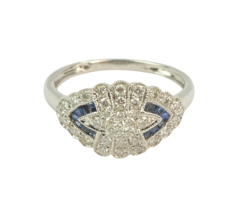 Prsten v art deco tvarosloví z bílého zlata ryzosti 585/1000 osazený přírodními safíry o celkové hmotnosti 0,10 ct a diamanty briliantového brusu o celkové hmotnosti 0,45 ct (SI-PI/H). Celková hmotnost prstenu je 2,80 g. Velikost 56.