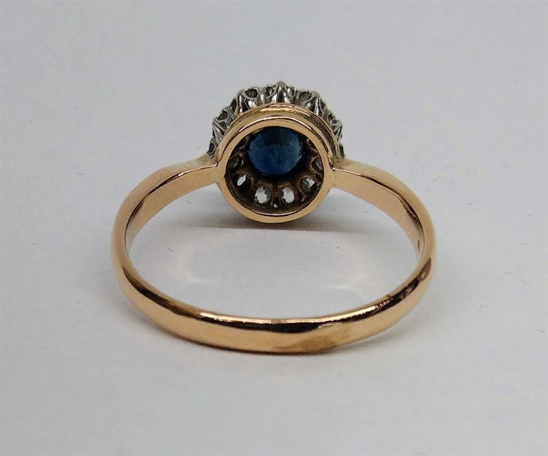 Zlatý prsten se sytě modrým přírodním safírem o průměru 0,5 cm a 11 diamanty briliantového brusu, celkem 0,33 ct, osazenými v koruně z bílého zlata. Celková hmotnost Au 3,86 g/585/1000, punc. Západní Evropa, třetí čtvrtina 20. století, průměr hlavy 1 cm, velikost prstenu 60.