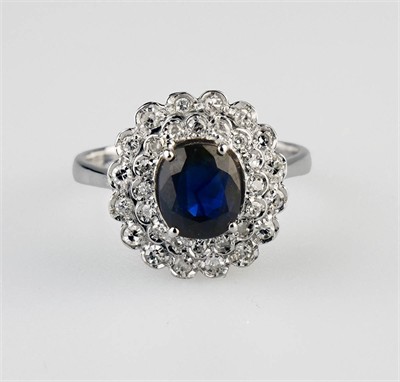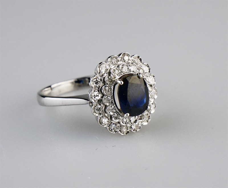 Zlatý prsten s přírodním safírem a diamanty briliantového brusu, safír o hmotnosti 1,25 ct, 32 kusů diamantů cca 0,50 ct. Celková hmotnost Au 4,23 g/750/1000, punc. Západní Evropa, začátek 21. století, velikost prstenu 53.