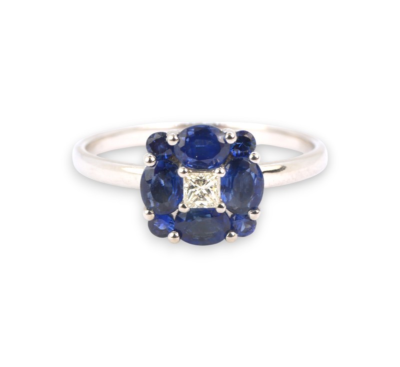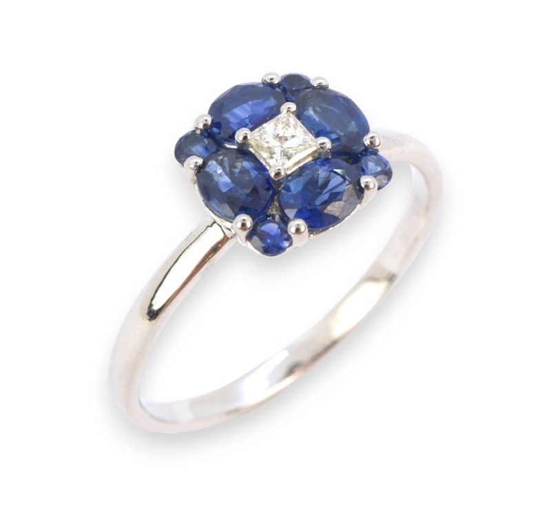Prsten z bílého zlata ryzosti 585/1000 se safíry o celkové hmotnosti 0,80 ct a diamantem briliantového brusu o hmotnosti 0,07 ct (SI-PI/H). Celková hmotnost prstenu je 2,04 g. Velikost 56.
