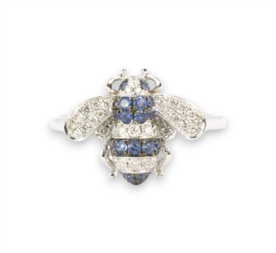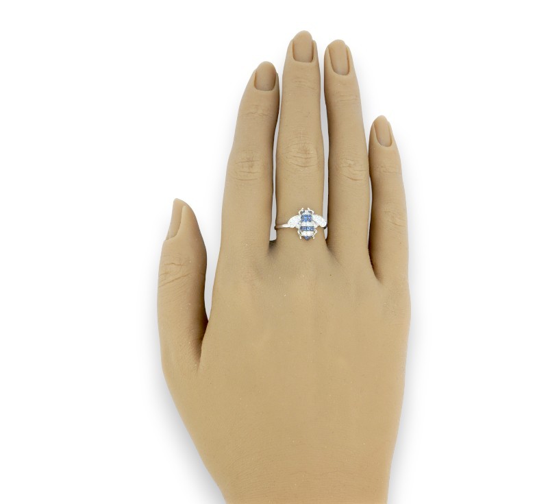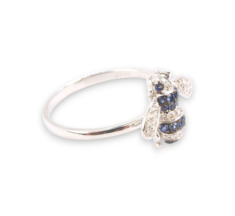 Prsten z bílého zlata ryzosti 585/1000 ve tvaru včely se safíry o celkové hmotnosti 0,10 ct a diamanty briliantového brusu o celkové hmotnosti 0,15 ct. Celková hmotnost prstenu je 2,22 g. Velikost 56.