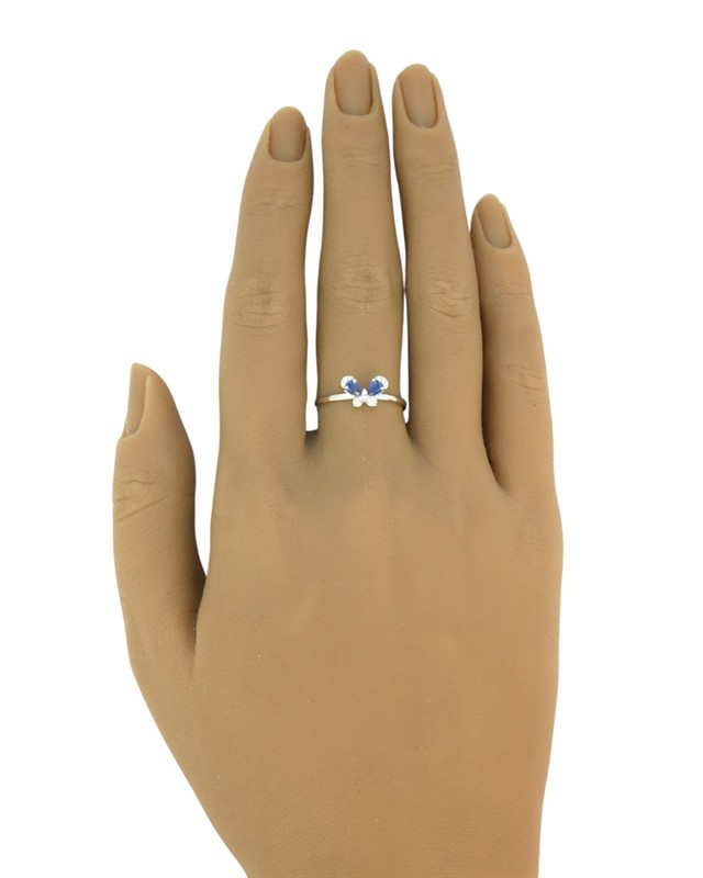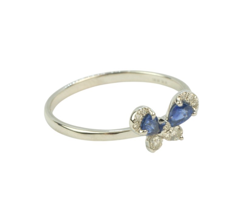 Prsten - motýlek z bílého zlata ryzosti 585/1000 osazený safíry o celkové hmotnosti 0,30 ct a diamanty briliantového brusu o celkové hmotnosti 0,10 ct (SI-PI/H). Celková hmotnost prstenu je 1,59 g. Velikost 56.