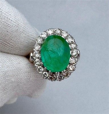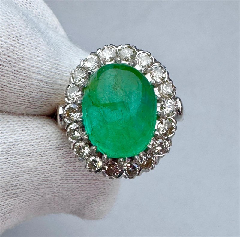 Zlatý prsten se smaragdem a brilianty. Pprsten je osazen přírodním smaragdem cabochon o váze cca. 6,00ct. (rozměry 12,5x10 mm) a 18ti přírodními diamanty - brilianty o váze 1,08 ct. G/VSI , prsten je vyrobený ze zlata 585/1000 o váze 7,7 gramů, velikost 57.