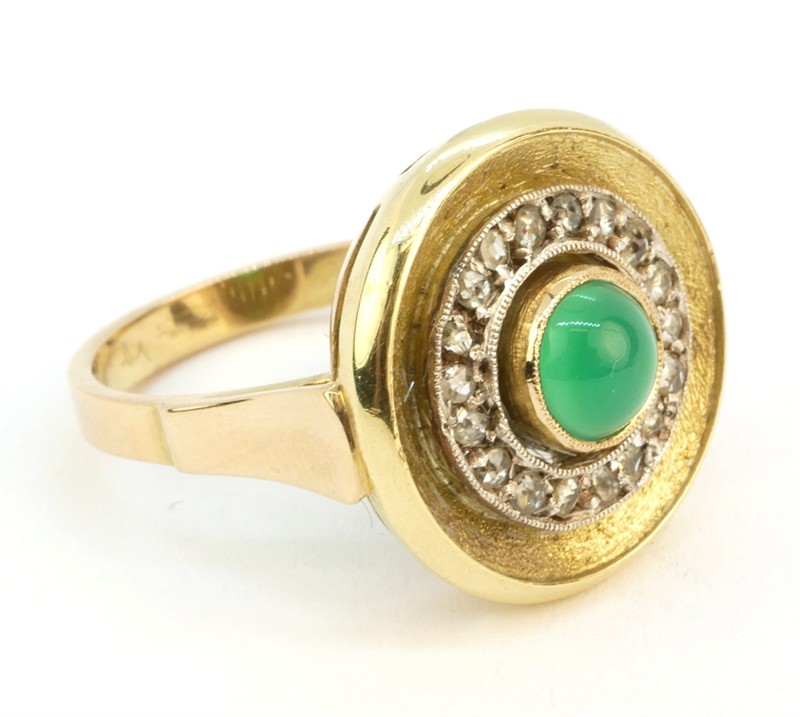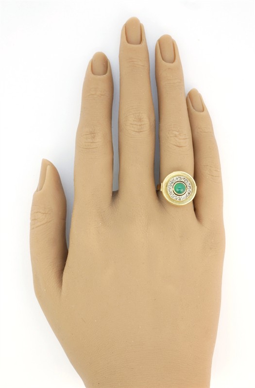 Prsten ze zlata ryzosti 585/1000 zdobený smaragdem broušeným do mugle a osmnácti diamantovými routami. Velikost prstenu 51. Celková hmotnost 5,50 g.