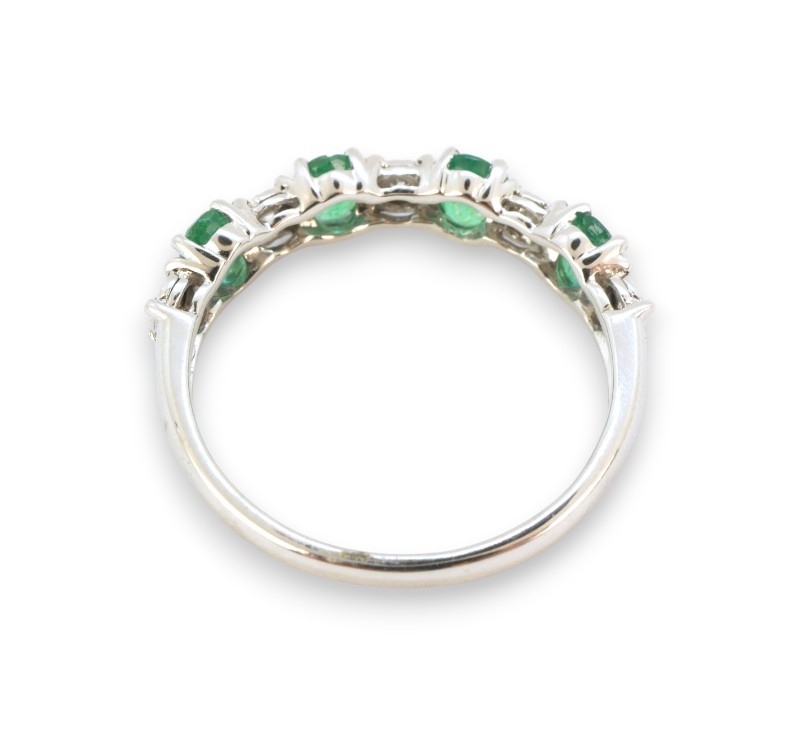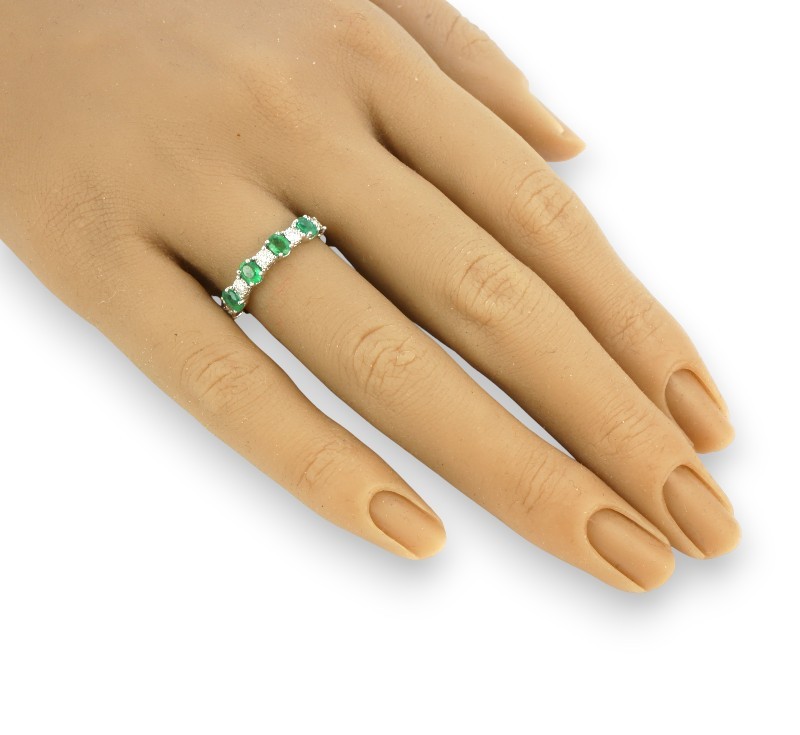 Prsten z bílého zlata ryzosti 585/1000 se smaragdy o celkové hmotnosti 0,60 ct a diamanty briliantového brusu o celkové hmotnosti 0,05 ct. Celková hmotnost prstenu je 1,93 g. Velikost 53.