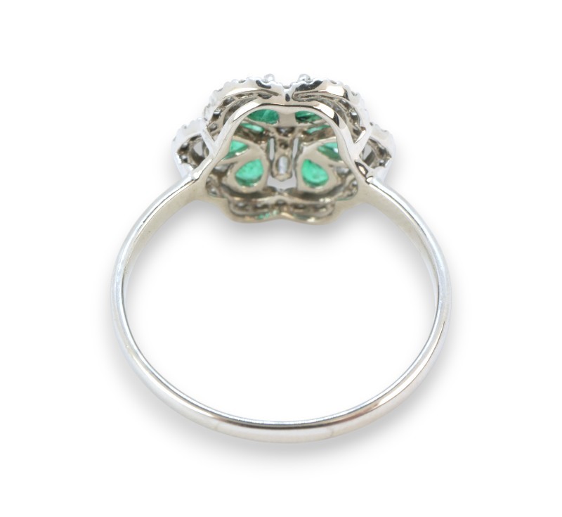 Prsten z bílého zlata ryzosti 585/1000 osazený sytě zelenými přírodními smaragdy o celkové hmotnosti 0,70 ct a diamanty briliantového a bagetového brusu o celkové hmotnosti 0,35 ct . Celková hmotnost prstenu je 2,32 g. Velikost 56.