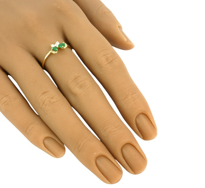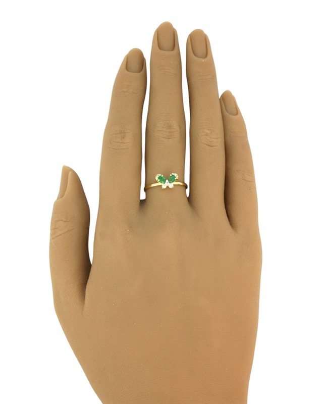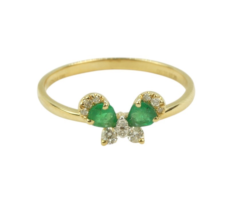 Prsten - motýlek ze žlutého zlata ryzosti 585/1000 osazený smaragdy o celkové hmotnosti 0,20 ct a diamanty briliantového brusu o celkové hmotnosti 0,10 ct (SI-PI/H). Celková hmotnost prstenu je 1,59 g. Velikost 56.