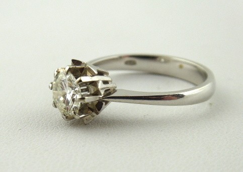 Zlato bílé 18 karátové, přírodní diamant. Ryzost Au 750/1000, celková hmotnost 3,70 g. Prsten z bílého zlata s větším kvalitním přírodním diamantem zasazeným ve vyvýšené korunce s krapnami tvořící efekt ornamentu hvězdy z čelního pohledu. Uprostřed přírodní diamant moderního briliantového brusu o hmotnosti 0,80 ct, barva I, čistota VS1. Značeno: ryzost 750, platný český punc, nečitelný italský punc. Itálie, třetí třetina minulého století. Velikost prstenu 54.