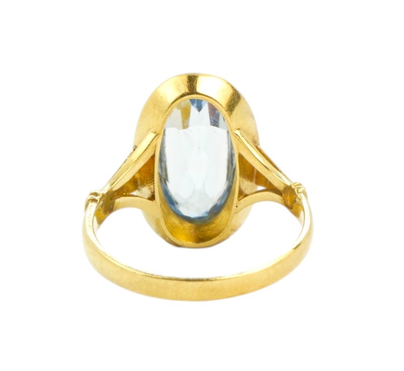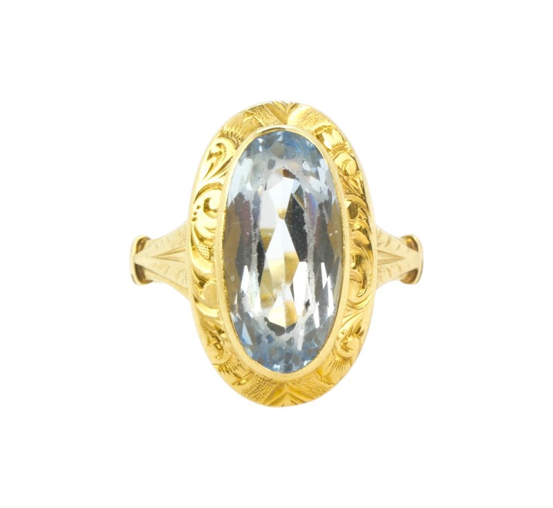 Art deco prsten vyrobený ze zlata ryzosti 585/1000 zdobený velkým broušeným spinelem. Rozměr hlavy prstenu 1,1 x 1,8 cm. Velikost 55. Hmotnost 3,61 g.
