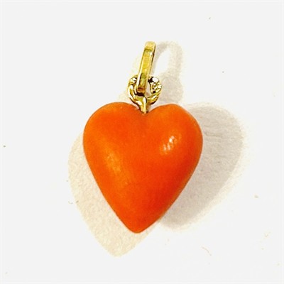 Decentní přívěšek, jehož tělo ve tvaru srdce je tvořeno z přírodního červeného mořského korálu. Šperk s tradiční symbolikou, vhodné i na tzv. "žebrácký náramek",tuzemská zlatnická práce z 30. let 20. století. Zhotoveno ze žlutého 14 karátového zlata, tj. o ryzosti 585/1000; prvorepublikový punc Z-41 (český lev 4) a další značka na oušku. Hmotnost 0,67 g, celková délka 15 mm, šířka 10 mm. V zachovalém stavu.