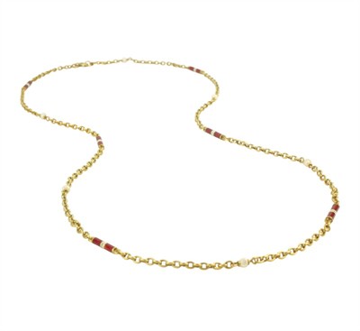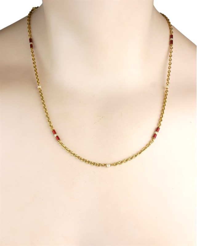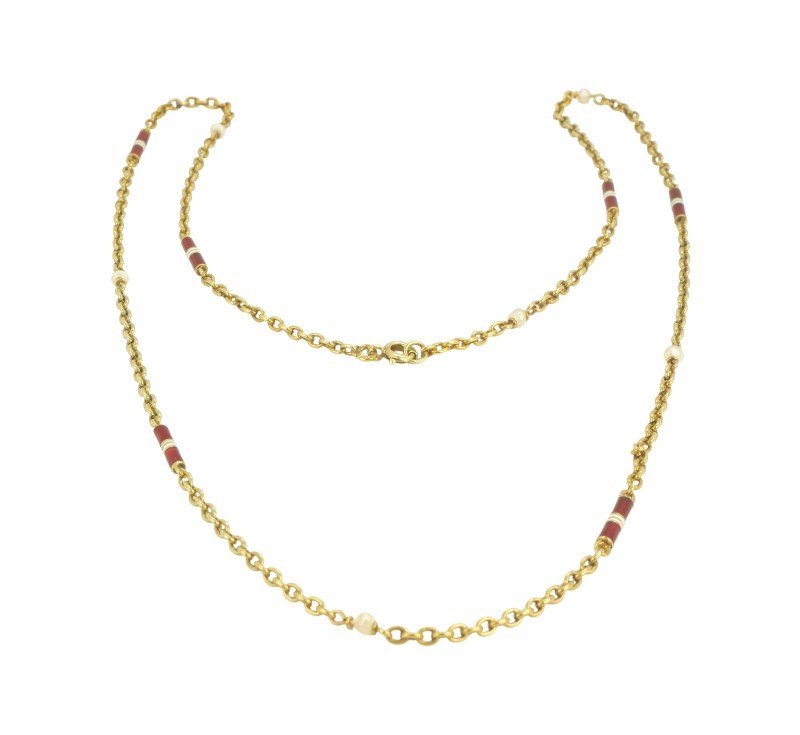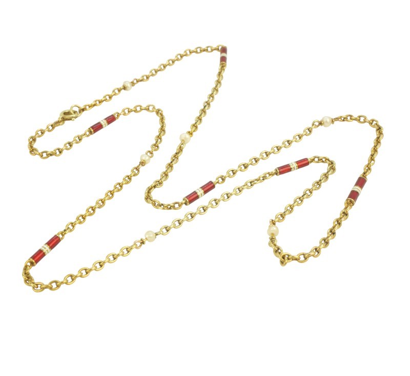 Starožitný zlatý řetízek se smaltem a perličkami, 14 karátové žluté zlato 585 / 1000, celková váha 8,03 g ,platný punc – čejka, Celková délka je 56 cm.