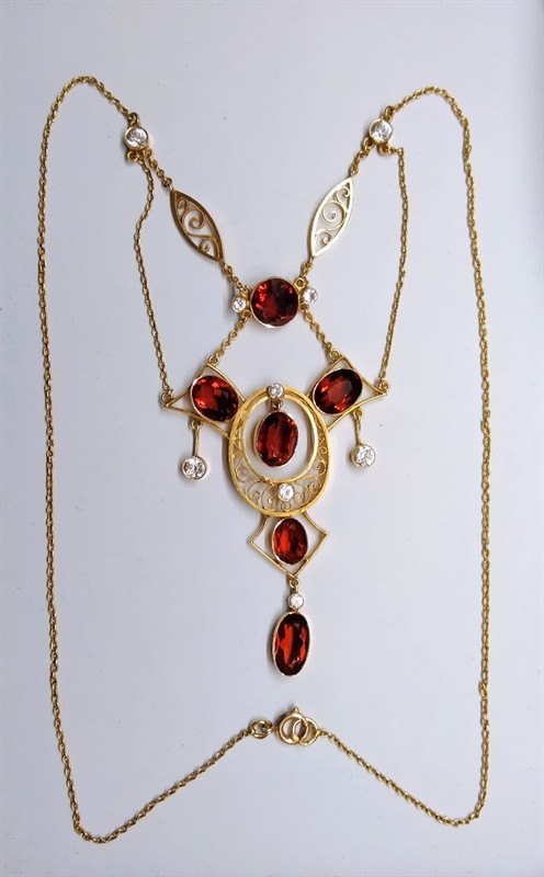 Zlatý secesní náhrdelník s almandiny a leukosafíry