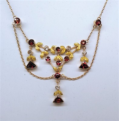 č. 179 965 Zlatý secesní náhrdelník s almandiny a leukosafíry