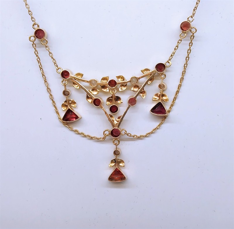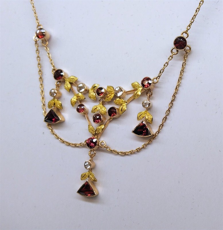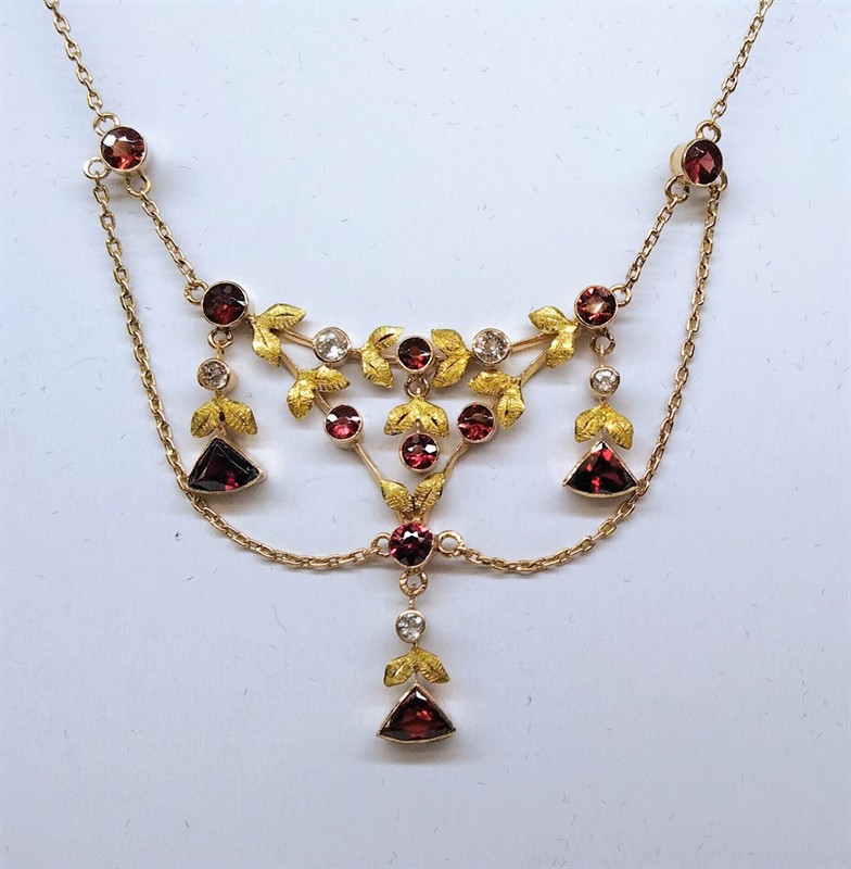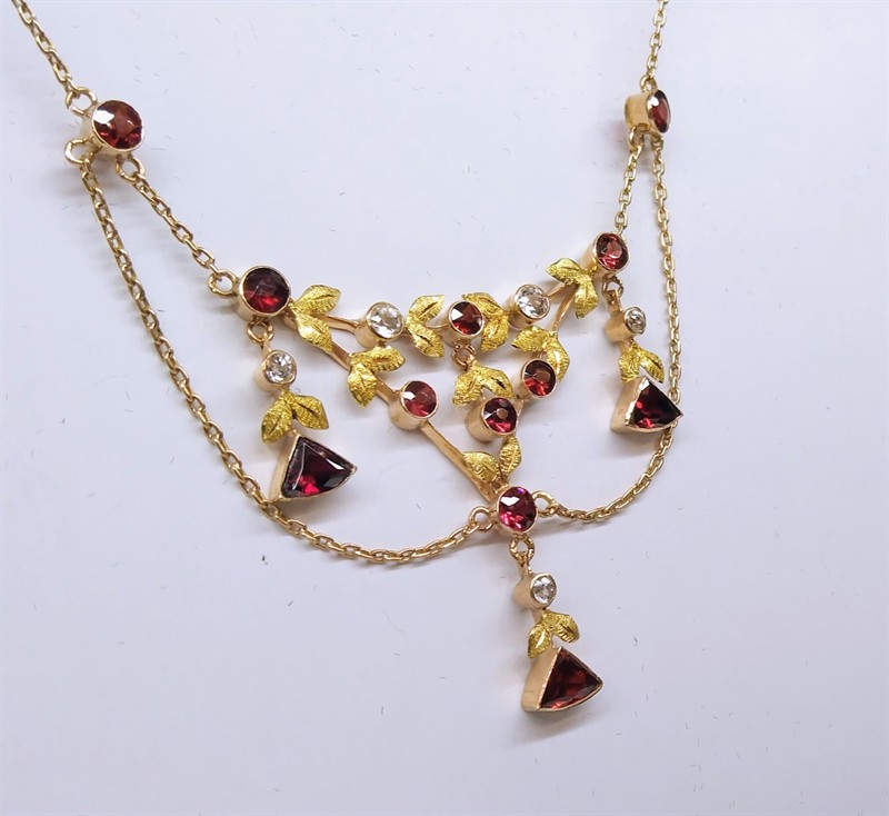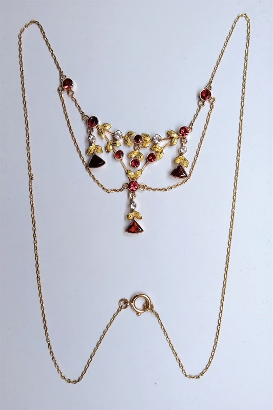 Zlatý secesní náhrdelník s almandiny a leukosafíry