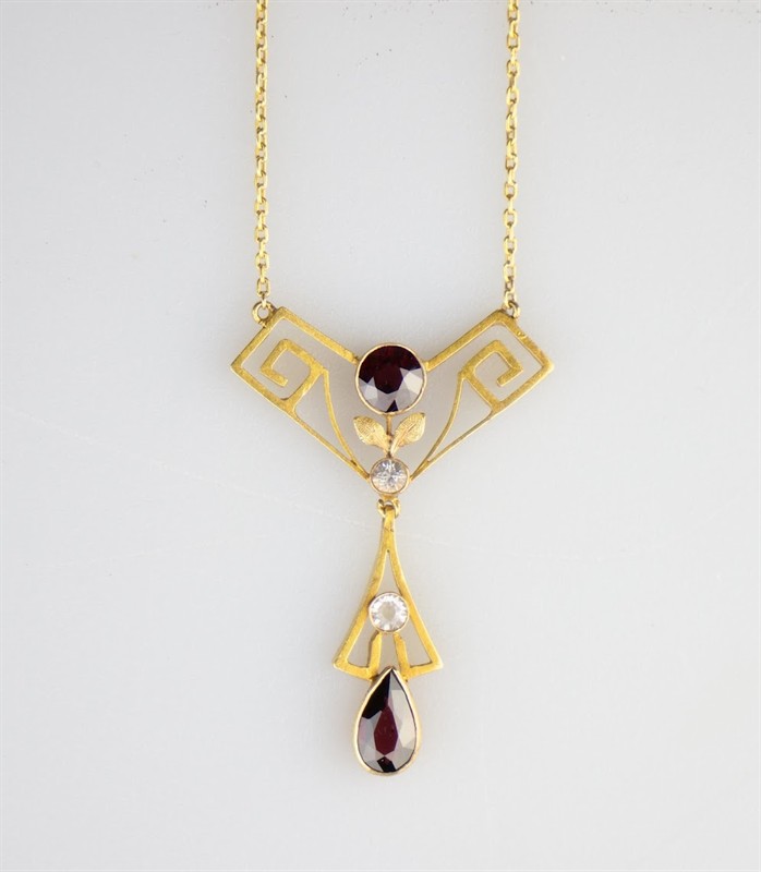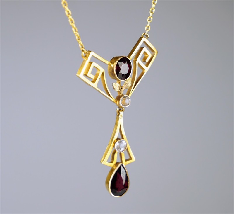 Zlatý pozdně secesní geometrizující náhrdelník se syntetickými rubíny a leukosafíry, s drobným florálním motivem. Celková hmotnost 5,50 g, Au 580/1000, punc liška (Z - 27), Praha. Kameny kruhového a kapkového brusu zafasovány v soudkovitých obrubách. Špičková šperkařská práce, České království, druhá dekáda 20. století. Délka závěsu 4,3 cm, šířka 2,9 cm, délka řetízku 38 cm.