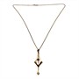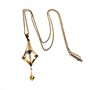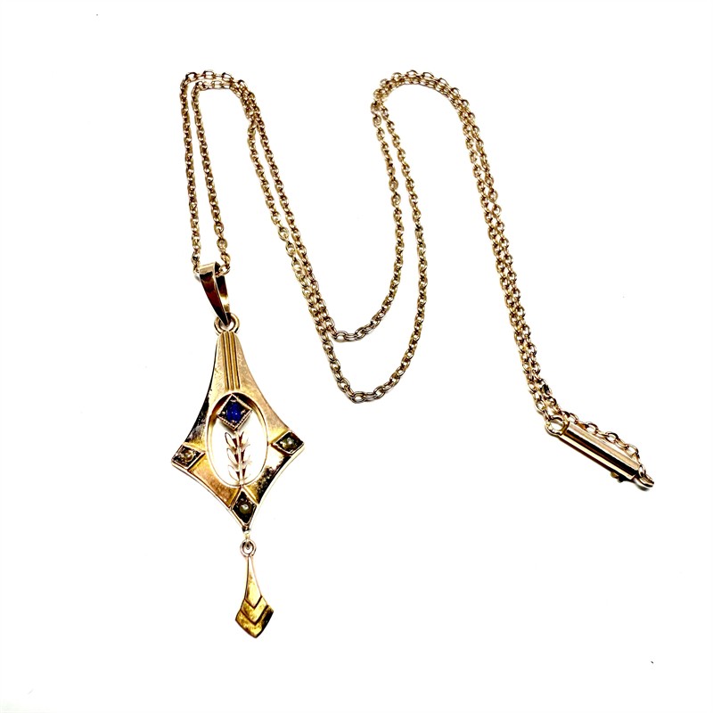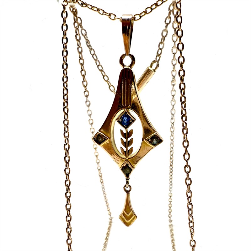 Jemný, velmi půvabný náhrdelník zhotovený ze zlata růžového odstínu v první polovině 20.století v secesním stylu. Řetízek zdobí odnímatelný závěs s modrým modrý safírem, který byl decentně dozdoben třemi říčními perlami. Zlato ryzosti 333/1000, celková váha 3,40 g. Délka řetízku 45 cm, rozměry závěsu 4,5 x 1,5 cm. Ke šperku je zhotoveno osvědčení puncovního úřadu. Profesionálně vyčištěno, perfektní stav.
