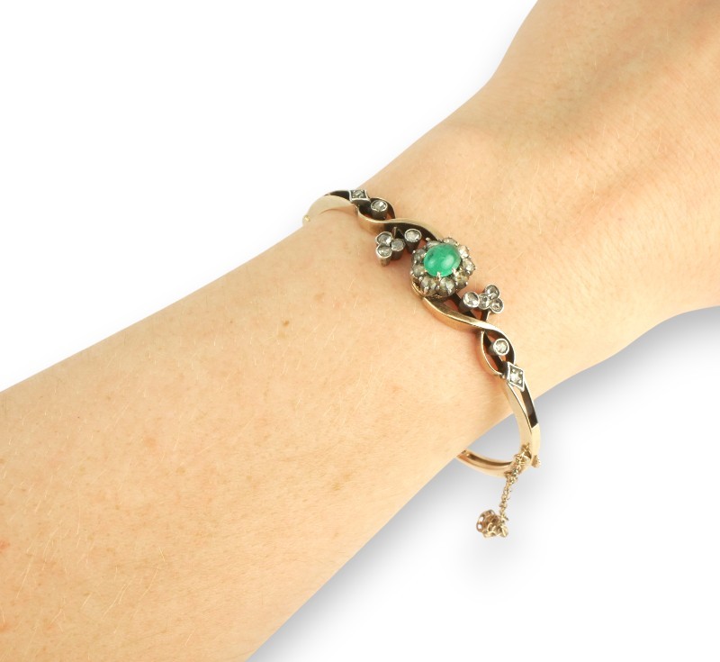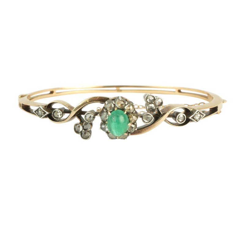 Elegantní, dekorativní otevírací náramek z období secese, hlavice ze splétaných křivek inspirovaných florální říší, uprostřed osazeno oválnou muglí přírodního smaragdu o váze 1,00 ct, jež je dobré kvality, rámováno a dále doplněno o přírodní diamanty routového brusu o celkové váze 0,60 ct (21 ks), jejichž kvalita je dobrá až střední. Spodní část odlehčena průsvitkami. Západoevropská klenotnická práce z konce 19. století. Zhotoveno z narůžovělého žlutého 14 karátového zlata, tj. o ryzosti 585/1000, kameny uloženy ve stříbře o vysoké ryzosti 980/1000; vyhotoveno osvědčení puncovního úřadu, neznačeno. Hmotnost 16,22 g, vnější délka 64 mm, vnitřní délka 58 mm, šířka hlavice 13 mm. Jazýčkové zapínání včetně pojistného řetízku v pořádku. Ponecháno s přirozenou patinou, lze vyčistit, celkově ve velmi zachovalém stavu. Součástí odborný posudek.