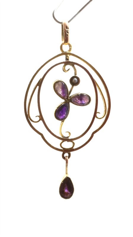Zlatý secesní přívěsek s ametysty a perličkou