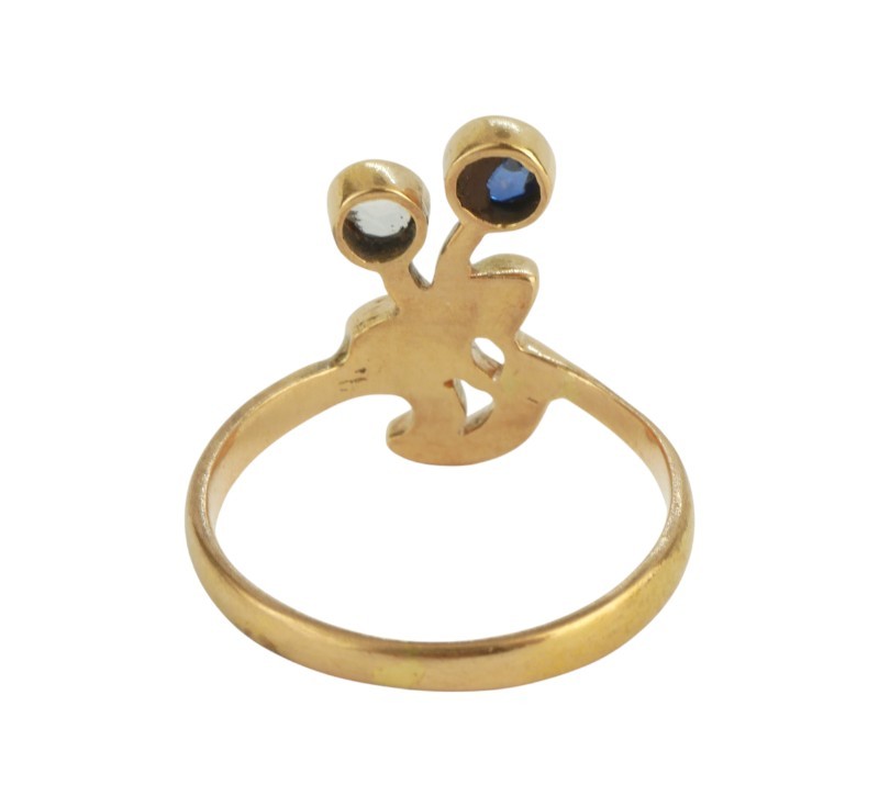 Starožitný zlatý prsten pochází z Rakouska - Uherska přelomu 19./20. století, z období secese a je osazen diamantem routového výbrusu a safírem, zlato o ryzosti 14 karátů 580/1000 o celkové hmotnosti 2,76 g, velikost prstenu 52, rozměr hlavy prstenu 1,5 x 0,80 cm.