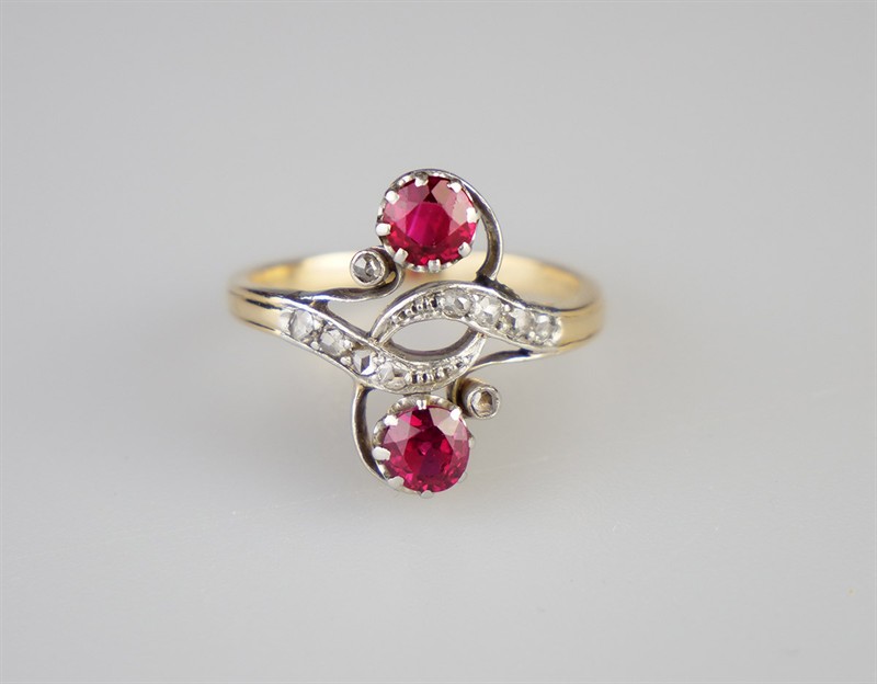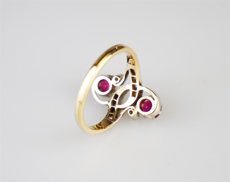 Zlatý secesní prsten se syntetickými rubíny a 10 diamanty routového brusu. Celková hmotnost Au + Pt 4,40 g/750 + 950/1000, osvědčení Puncovního úřadu. Francie, desátá léta 20. století, velikost prstenu 54
