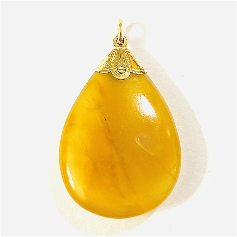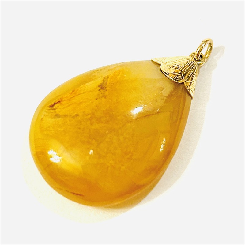 Nevšední, výrazný přívěšek, jemuž dominuje přírodní žlutý achát leštěný do ploché kapky, uchycení s vlnitým okrajem celoplošně zdobeno dekorativním rytím. Západoevropská či mimoevropská práce z 1. až 2. třetiny 20. století. Zhotoveno ze žlutého 14 karátového zlata, tj. o ryzosti 585/1000; nově opatřeno puncem Z-58 (labuť 4) na očku. Hmotnost 13,07 g, celková délka 45 mm, šířka 26,5 mm. Ve velmi zachovalém stavu, odborně vyčištěno a vyleštěno.