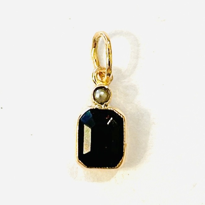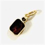 Decentní přívěšek osazený rudým sklem obdélného brusu, doplněno drobnou přírodní šedou perlou, fasováno v zrnitých obrubách. Vídeňská zlatnická práce z počátku 20. století. Zhotoveno z narůžovělého žlutého 14 karátového zlata, tj. o ryzosti 580/1000; rakousko-uherský punc Z-27 (liška 4) s písmenem „A“ (značí vídeňský puncovní úřad) a mistrovská značka "FK" na očku. Hmotnost 0,82 g, celková délka 17 mm, šířka 6 mm. Jedná se o konverzi z náušnice, v zachovalém stavu, odborně vyčištěno a vyleštěno zlatníkem.