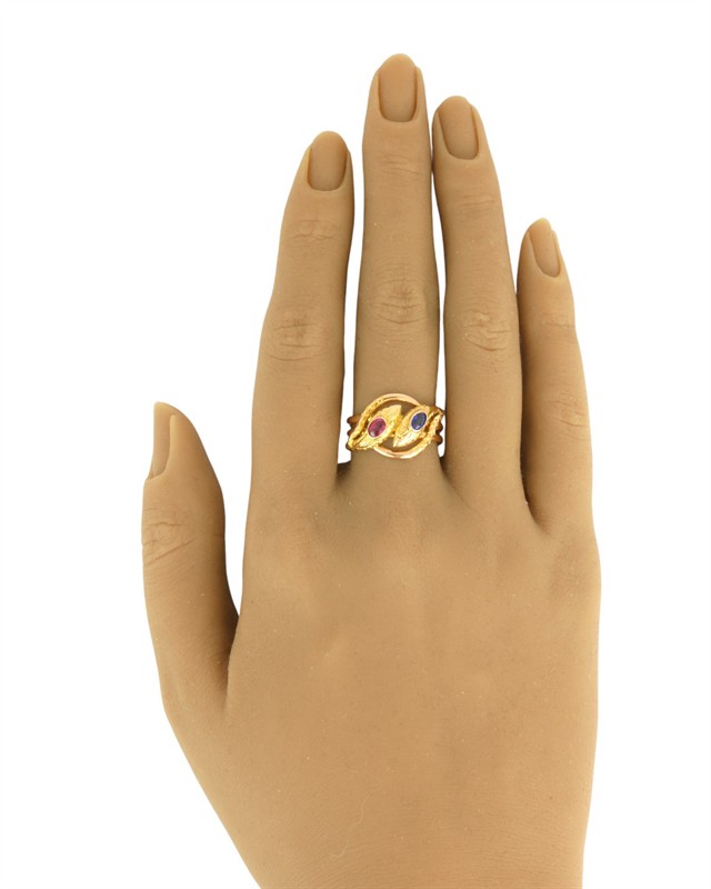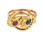 Zlatý starožitný prsten "hadi" s červeným a modrým kamenem