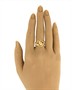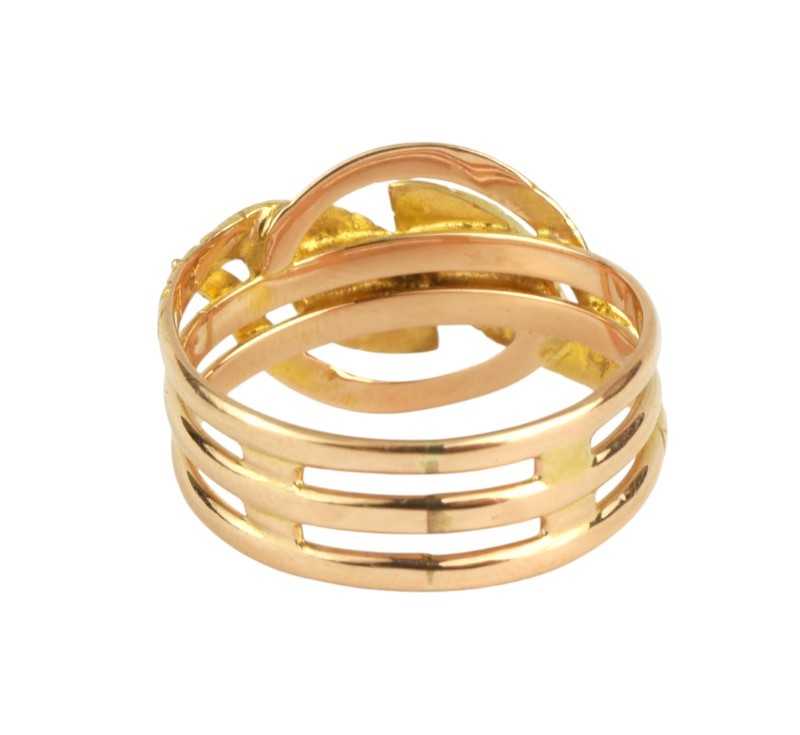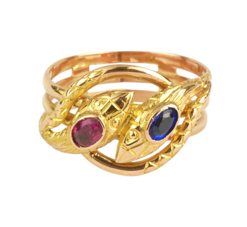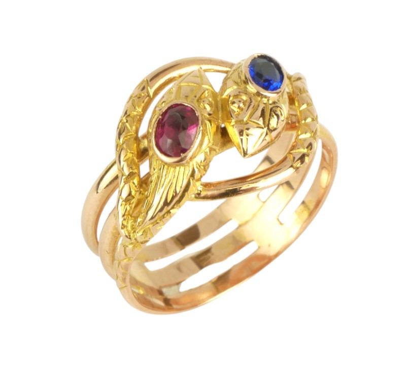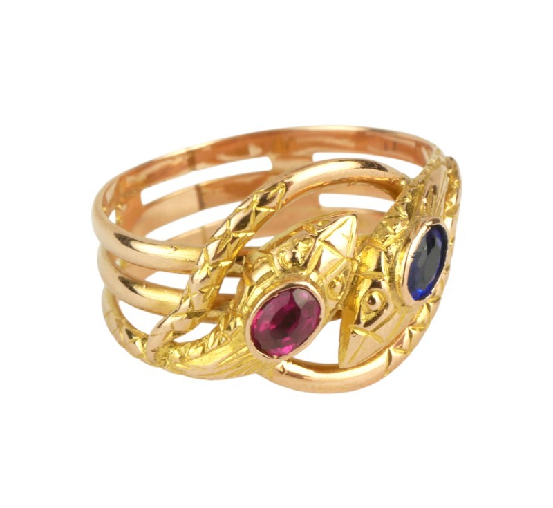 Nevšední, výrazný prsten s hlavicí s motivem dvou splétaných hadů, osazeno v plně přiléhající obrubě červeným a modrým kamenem oválného brusu (sklo či syntetika), těla detailně vystižena, širší šína ze tří pásů s průsvitkami. Šperk s tradiční symbolikou nejen síly a znovuzrození, jež byla nezřídka využívána ve šperkařství té doby. Precizní západoevropská klenotnická práce ze 3. čtvrtiny 19. století. Zhotoveno z narůžovělého žlutého 18 karátového zlata, tj. o ryzosti 750/1000; vyhotoveno osvědčení puncovního úřadu, neznačeno. Hmotnost 5,00 g, velikost 57,5, šířka 13 mm. Velikost v minulosti upravována, v zachovalém stavu, odborně vyčištěno a vyleštěno zlatníkem.