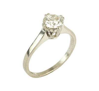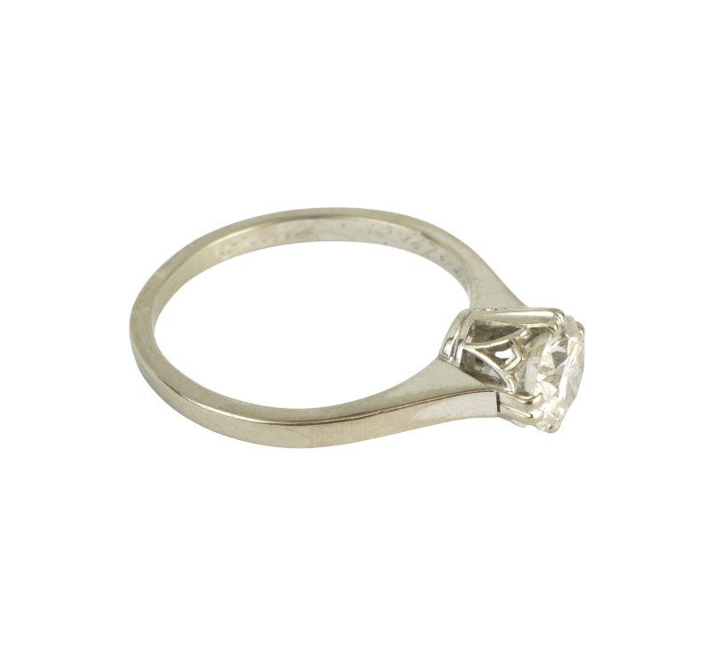 Elegantní, apartní prsten zásnubního typu osazený solitérním přírodním diamantem briliantového brusu o váze 0,77 ct, čistota IF (!), barva G-H, fasováno zdvojenými krapnami v dekorativně prořezávané koruně. Precizní klenotnická práce známého malmského klenotníka Gustava Dahlgrena z roku 1957. Velmi vysoká kvalita použitých materiálů a zpracování činí šperk i investiční příležitostí. Zhotoveno z bílého 18 karátového zlata, tj. o ryzosti 750/1000; nově opatřeno puncem Z-35 (kohout 3), švédské puncy "3 koruny", písmeno "M" (značící puncovní úřad v Malmö), datační značka "G13" a mistrovská značka "GD & Co", vyryto "Edith 19 10/963" a karetážní číslo "0.75" zevnitř šíny. Hmotnost 2,86 g, velikost 53, průměr hlavice 7 mm. Ve velmi zachovalém stavu, odborně vyčištěno a vyleštěno zlatníkem. Součástí odborný posudek.