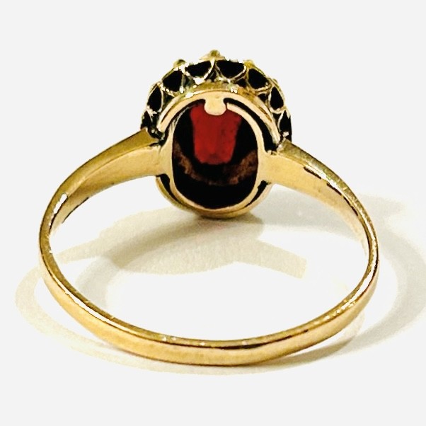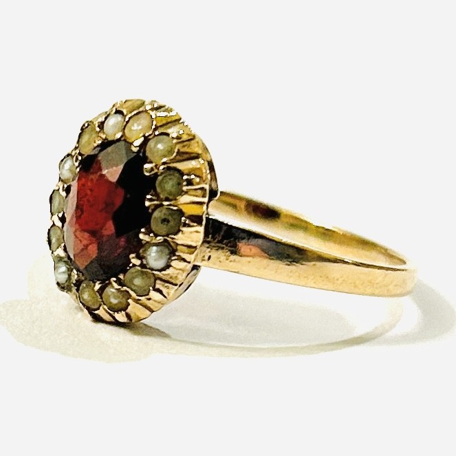 Elegantní, tradičně pojatý prsten osazený přírodním granátem oválného brusu, rámováno přírodními perlami, fasováno krapnami a v lůžkách, zdobně prořezávané průsvitky. Středoevropská zlatnická práce z poslední čtvrtiny 19. století. Zhotoveno z narůžovělého žlutého zlata, hlavice ze 14 karátového, tj. o ryzosti 585/1000, šína ze 13,7 karátového, tj. o ryzosti 570/1000; vyhotoveno osvědčení puncovního úřadu, neznačeno. Hmotnost 2,60 g, velikost 56, délka hlavice 11,5 mm. Hlavice patrně dříve odnímatelná, v zachovalém stavu, restaurováno, odborně vyčištěno a vyleštěno Monikou Zemanovou, DiS.